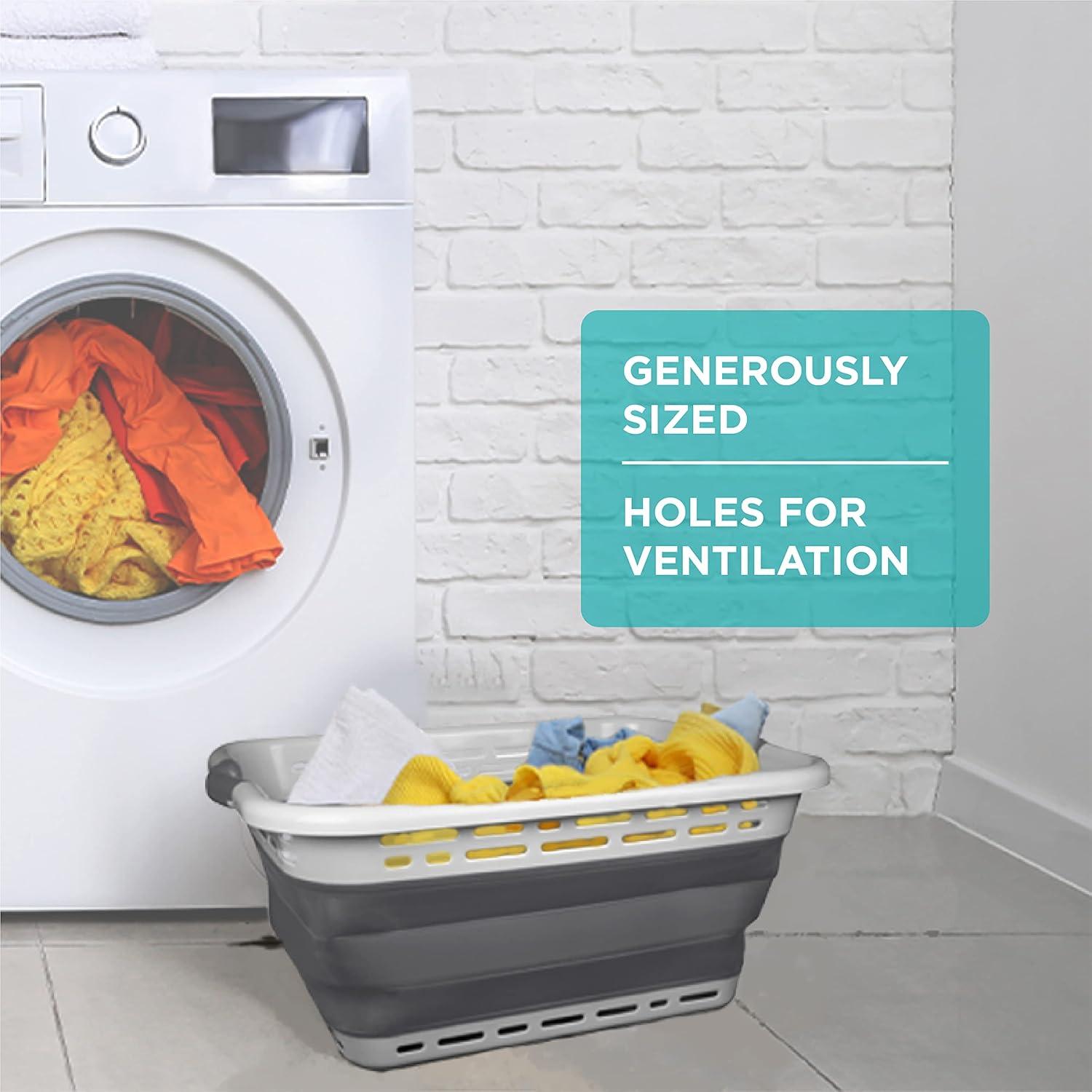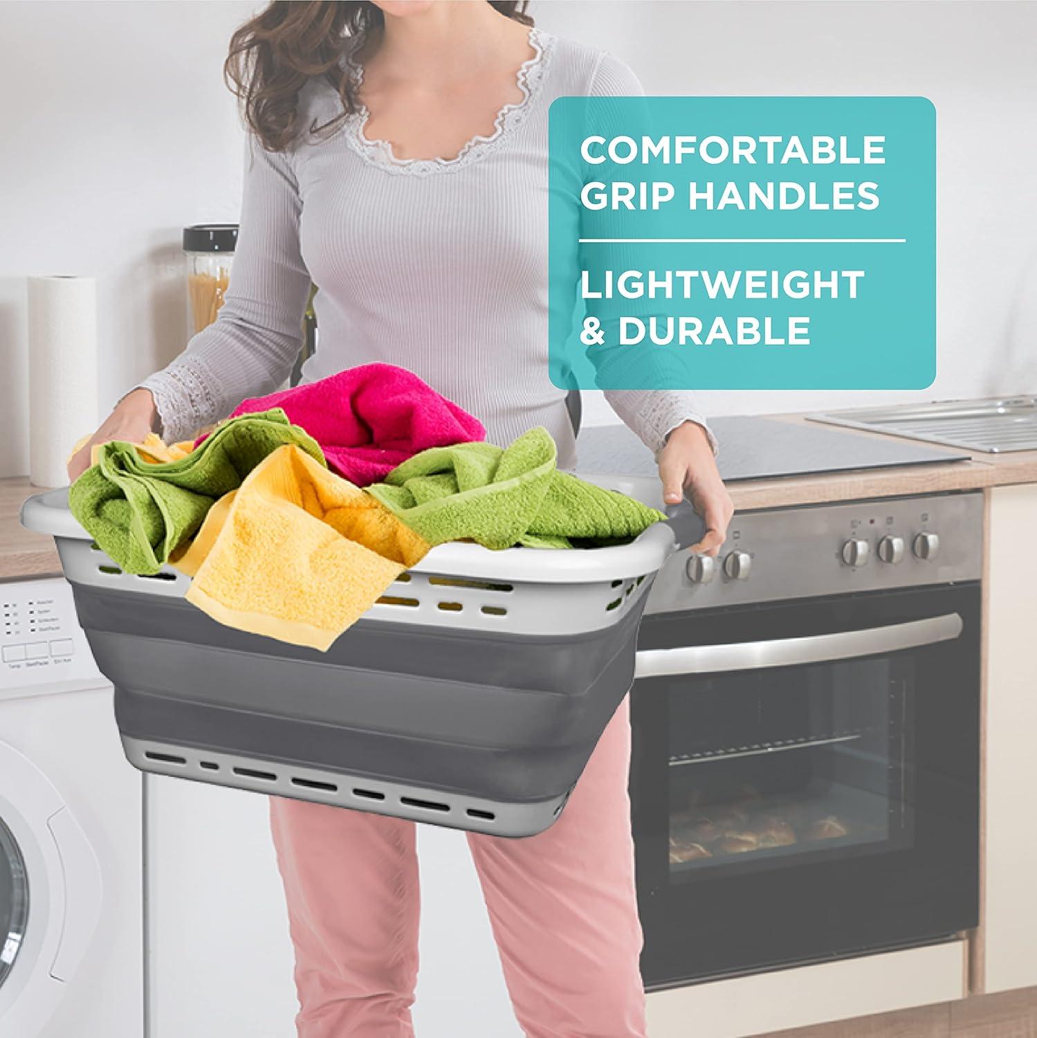 Each of our laundry baskets are generously sized measuring 10.5 x 24.25 x 17.5 inches when fully opened and just 3 inches high when folded down. The laundry basket features soft-grip, comfortable carry handles so they are easy to carry even when weighed down with heavy, wet laundry.