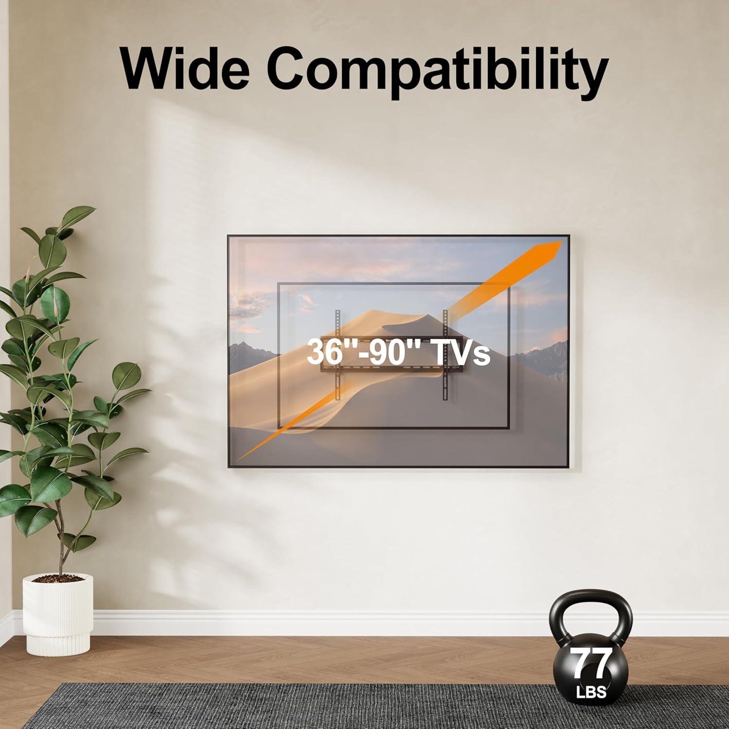 “Enhance your viewing experience with this versatile, heavy-duty TV mount designed to fit most 36″”-90″” flat-screen and curved TVs. Built for durability and stability, this mount supports up to 77 lbs, offering a secure hold for your TV. Whether you're mounting in your living room, bedroom, or office, this bracket is designed for easy installation on wood studs, concrete, and drywall. The mount also features an integrated cable management system to keep wires neatly hidden, adding to the sleek and tidy look of your space. Compatible with VESA patterns ranging from 100x100mm to 400x400mm, this mount fits a wide range of TV brands and models, making it the perfect solution for almost any home setup. Installation hardware and instructions are included, so you can easily mount your TV in no time.”