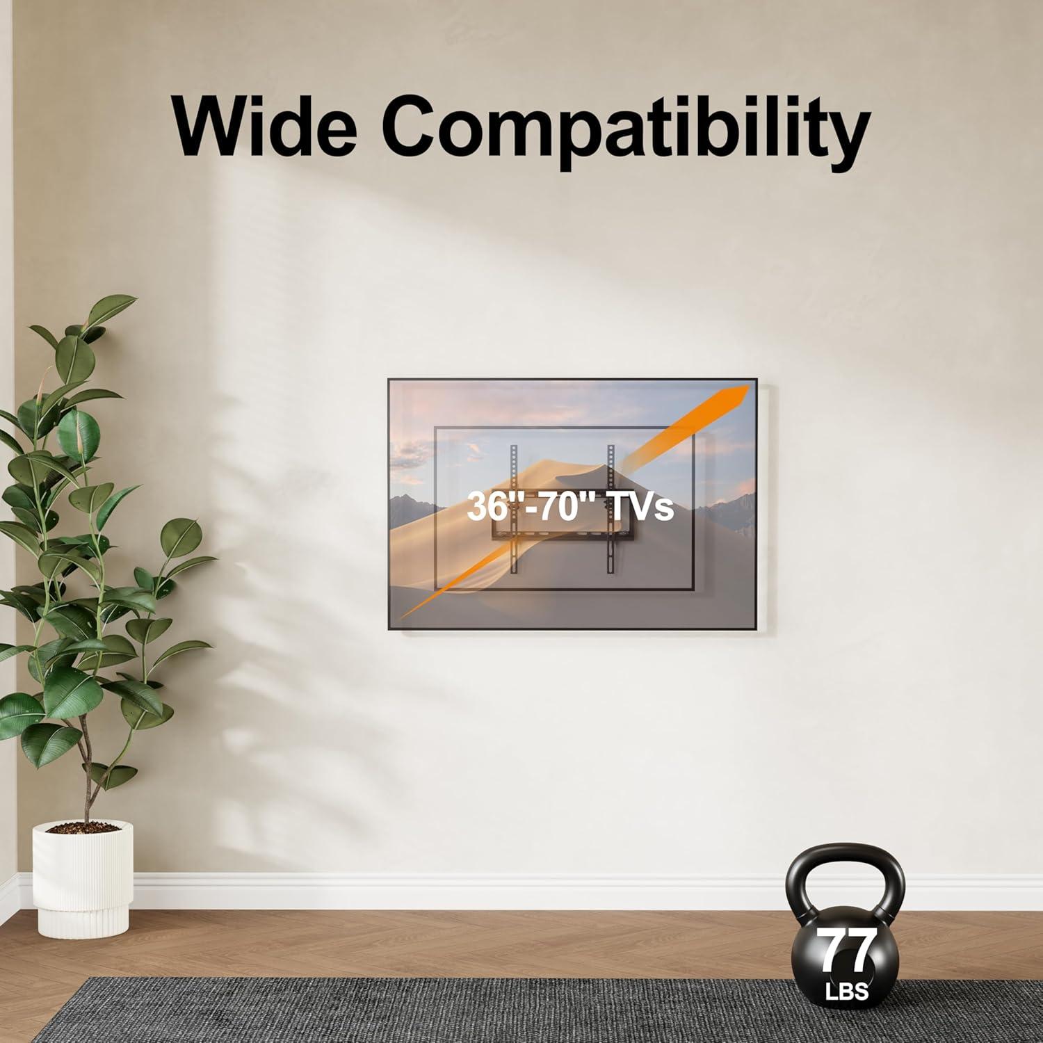 “Upgrade your viewing experience with this premium Tilted TV Mount, designed to fit most 36″”-70″” flat and curved TVs. This heavy-duty mount supports up to 77 lbs, providing a secure and stable platform for your larger television. Perfect for any room in your home, this mount offers effortless tilting to reduce glare and ensure the best viewing angles from any position. Featuring a simple yet effective tilt function, this mount allows you to easily adjust your TV up to 15° for improved comfort and reduced eye strain. Whether you're watching from the couch, standing, or lying down, you can customize the angle to suit your needs. The low-profile design keeps your TV close to the wall, providing a clean, modern look while saving space. With universal VESA compatibility (up to 400x400mm), this mount works with a wide variety of TV brands, making it the ideal choice for any setup. The easy installation process includes all necessary hardware and step-by-step instructions, so you can mount your TV with confidence.”